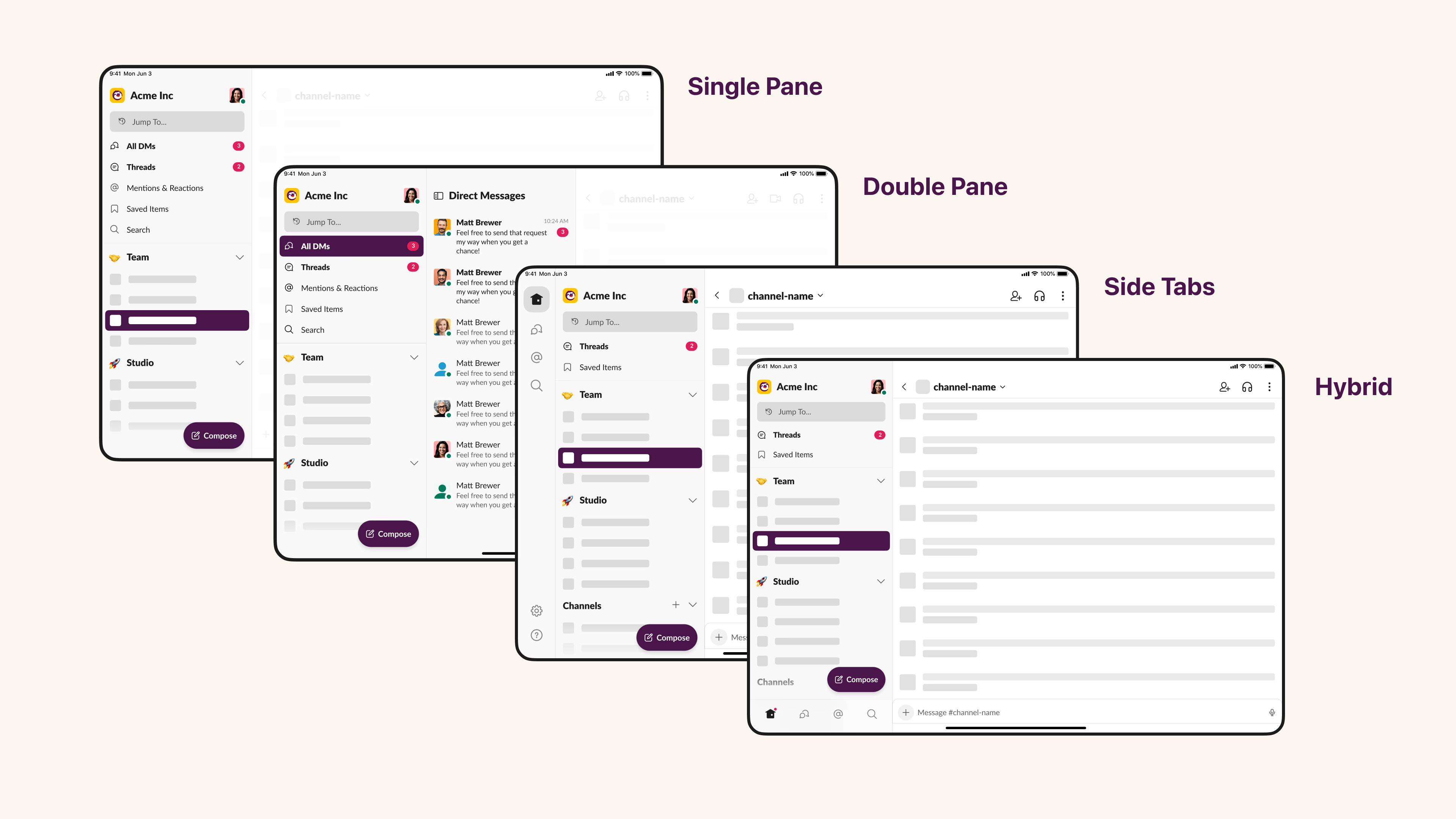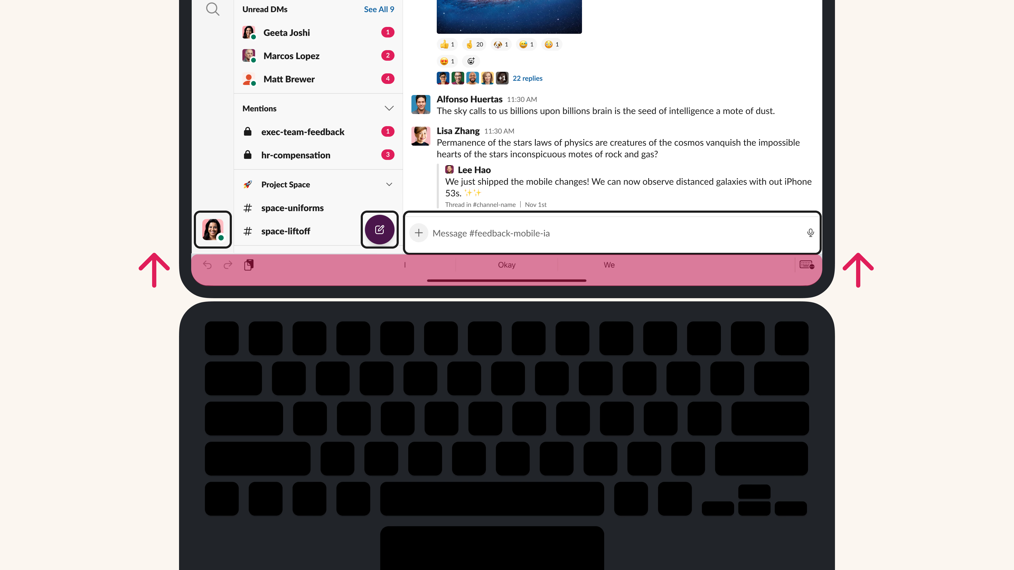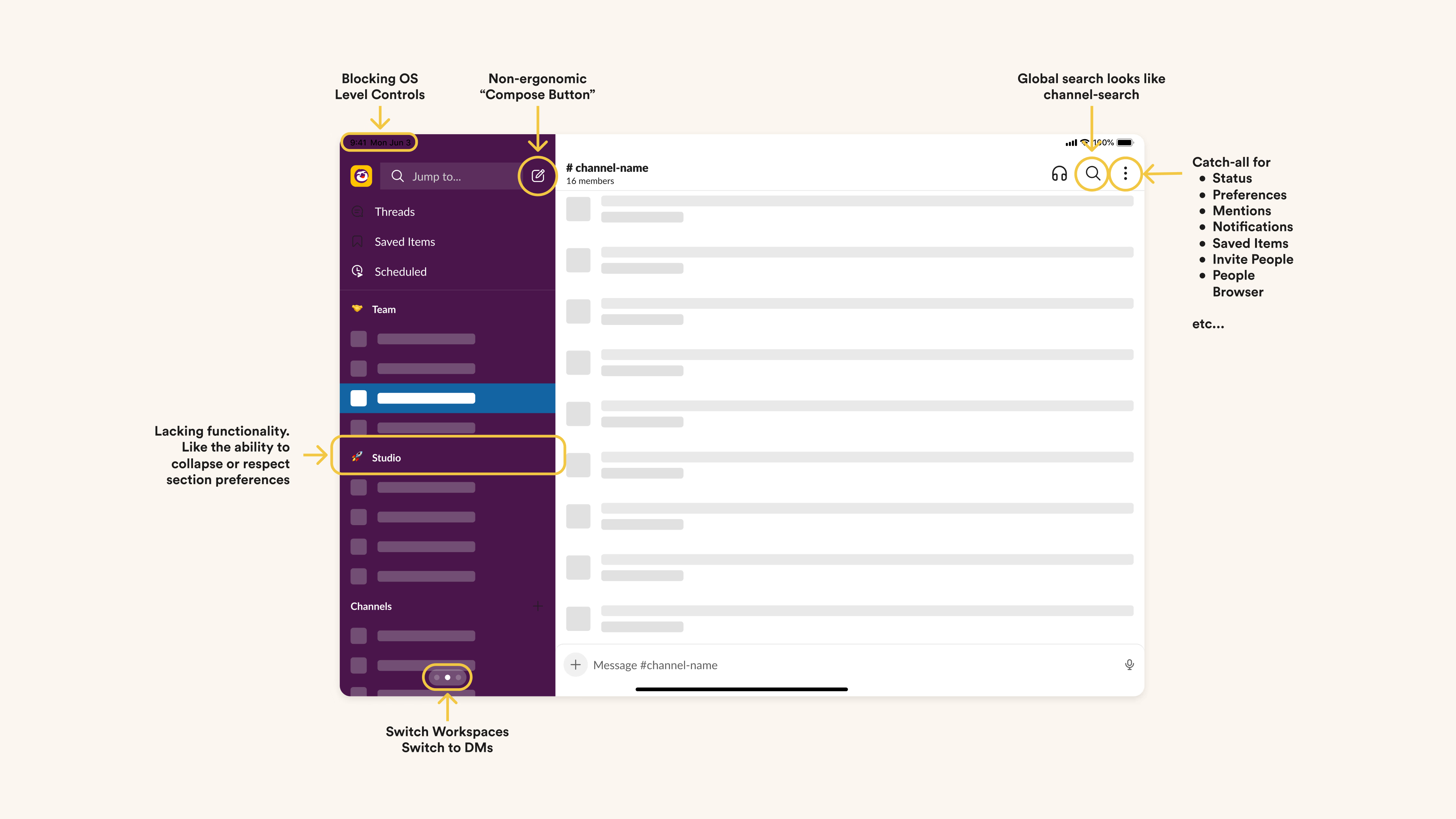 Rethinking the architecture. Slack on the iPad felt like a barebones version of the desktop app with some resemblance to our mobile clients. We believed the iPad app could become good enough and robust enough to help us step away from our desks, change up our environment for a few hours, and still be productive.