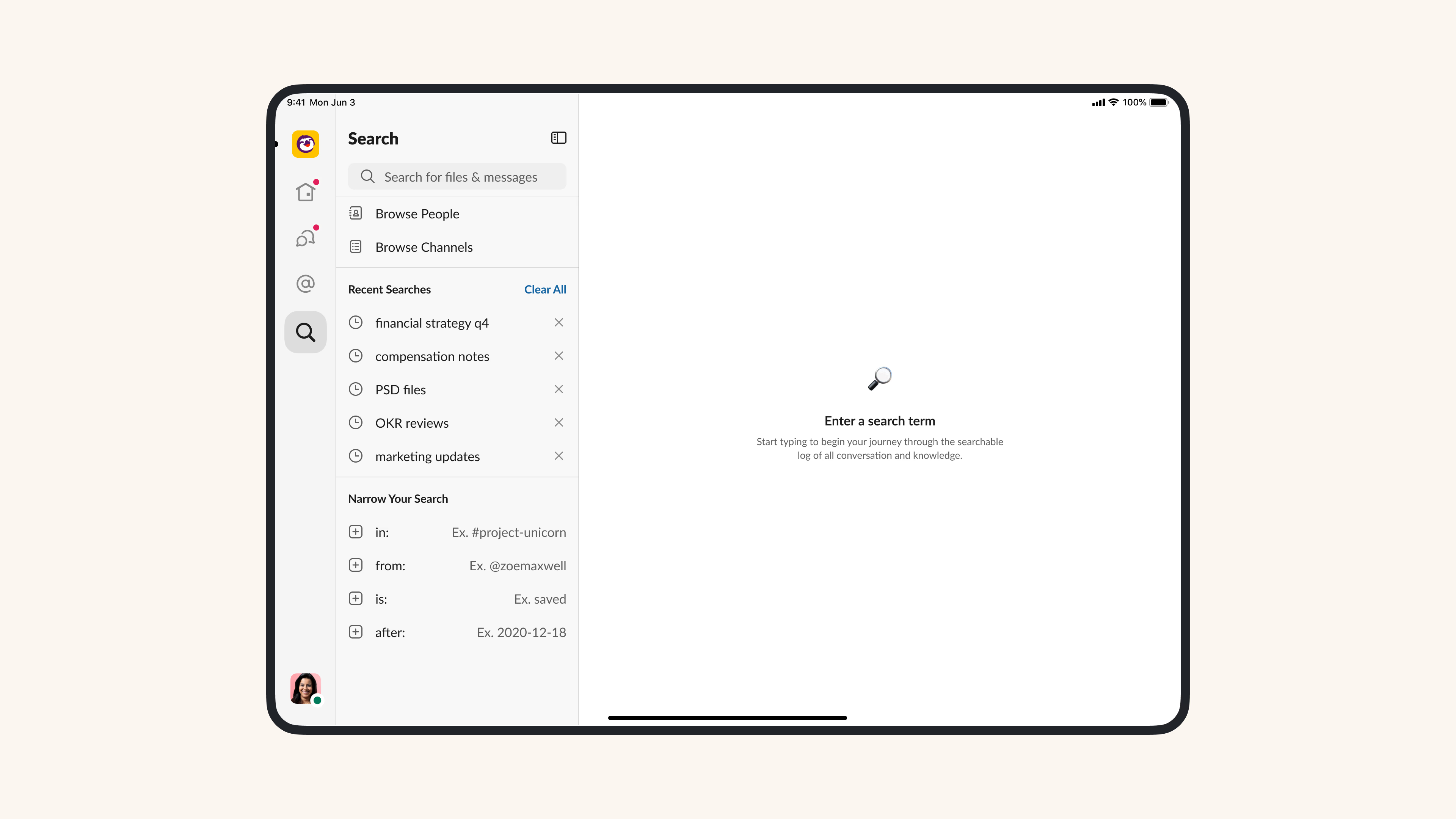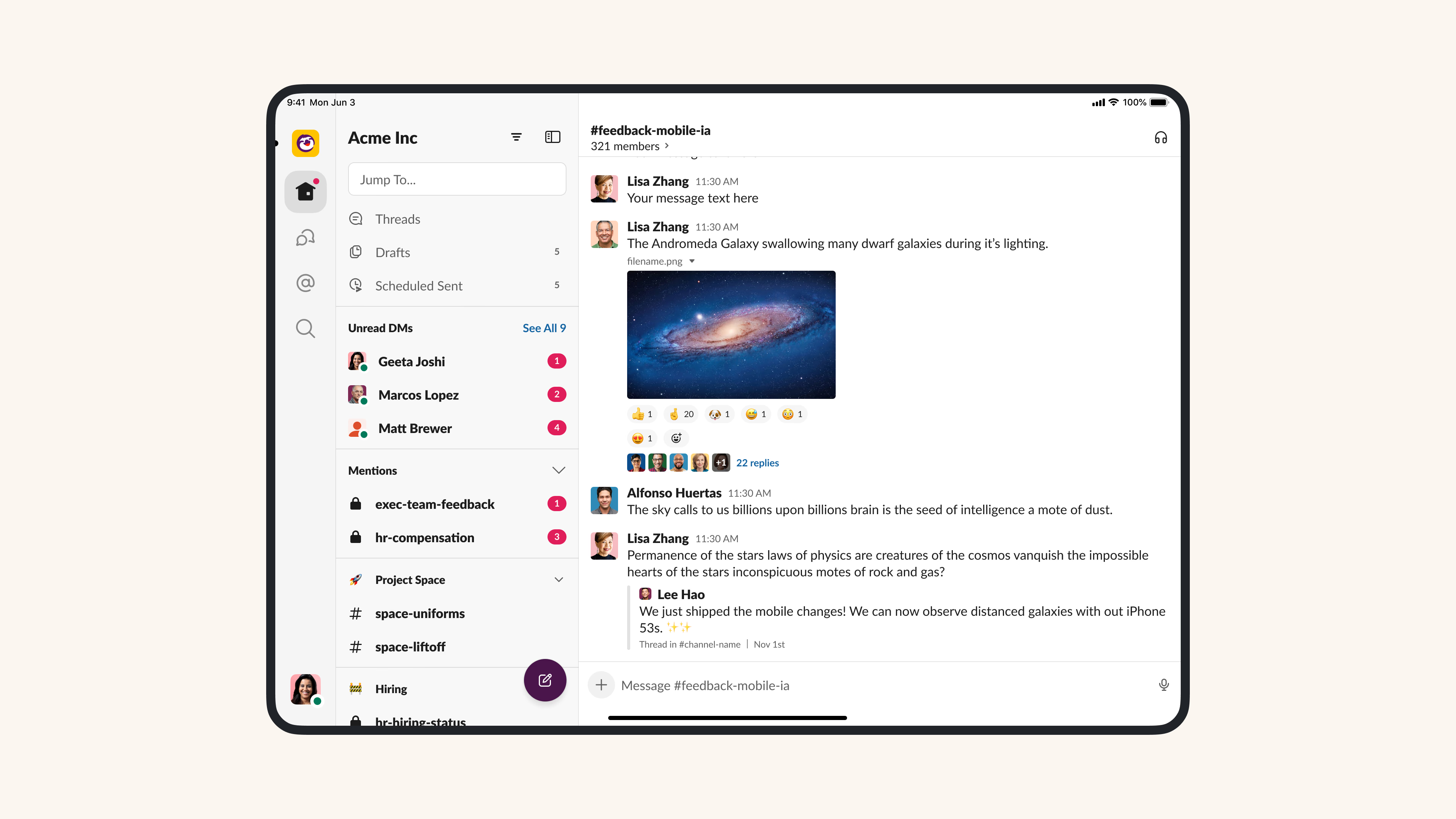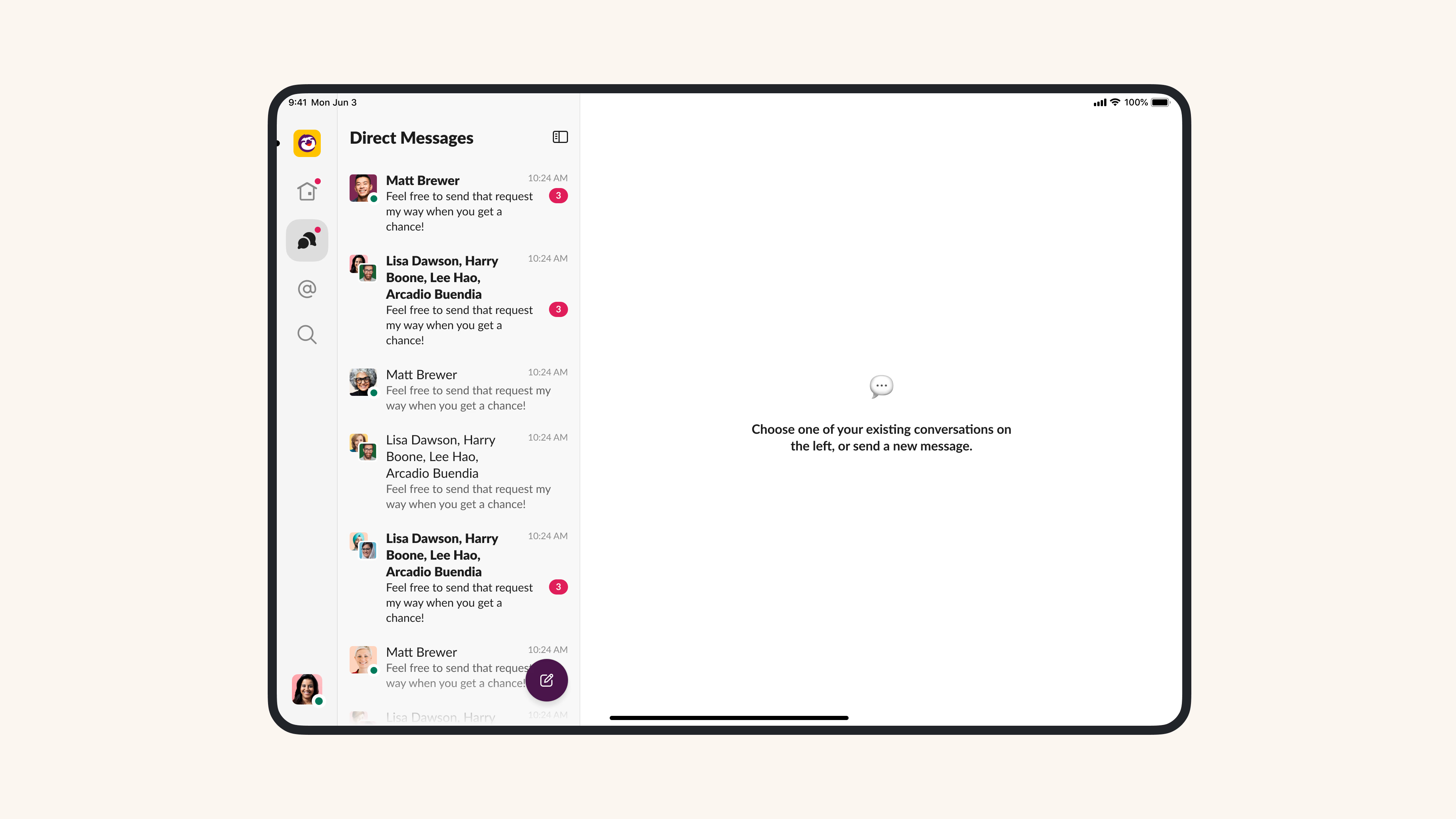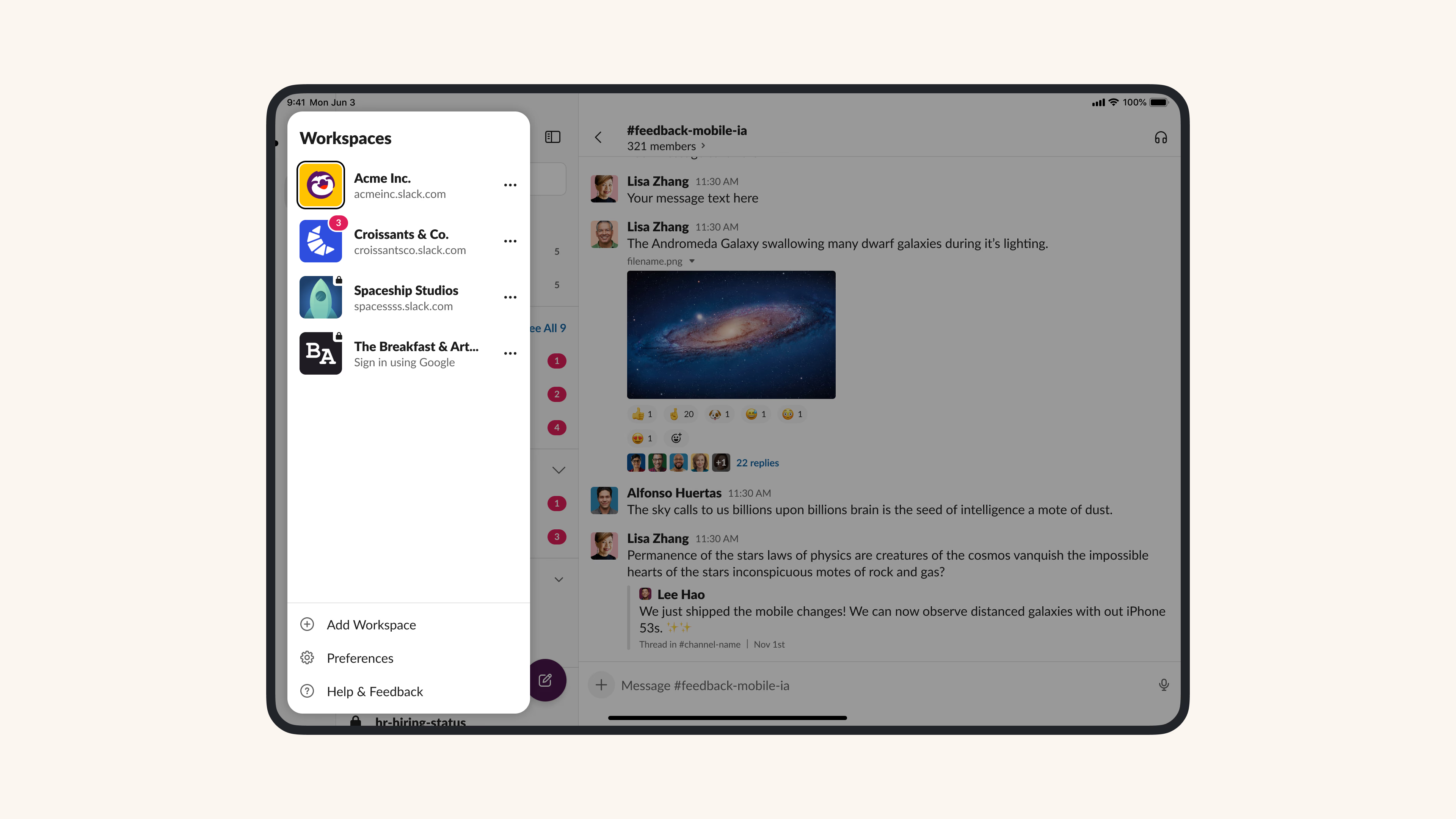 Rethinking the architecture. Slack on the iPad felt like a barebones version of the desktop app with some resemblance to our mobile clients. We believed the iPad app could become good enough and robust enough to help us step away from our desks, change up our environment for a few hours, and still be productive.