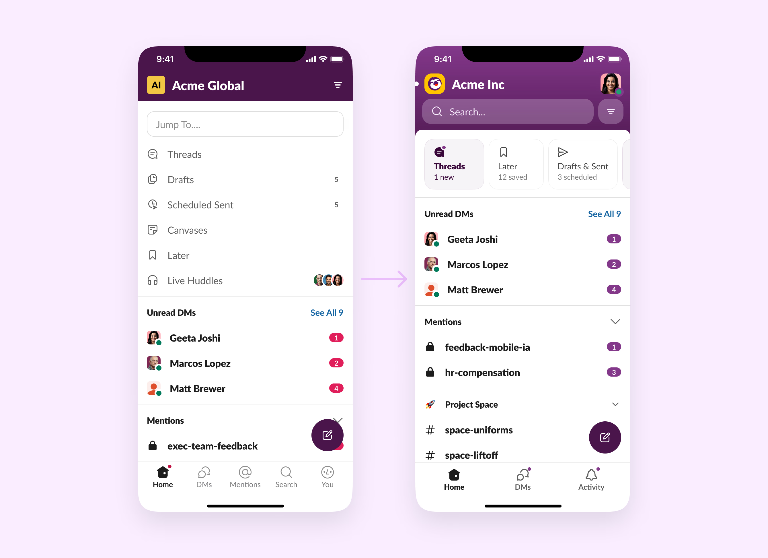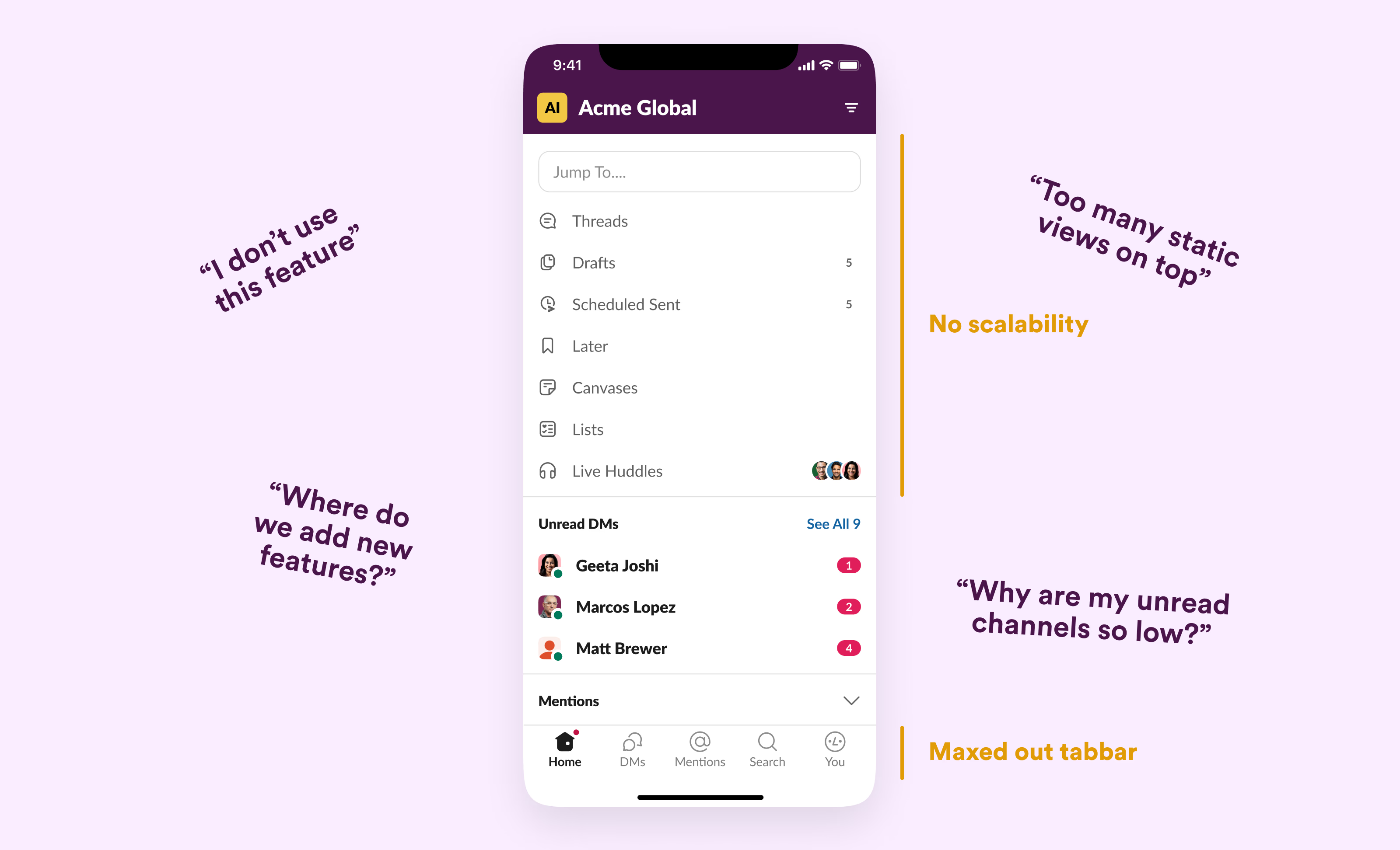 Taking bold bets. Our team (all of Slack really) shared a common goal - to enhance focus and predictability for our users, while ensuring better scalability for the business. It was about rethinking how people interact with an app that's become a cornerstone of many of our daily work lives.